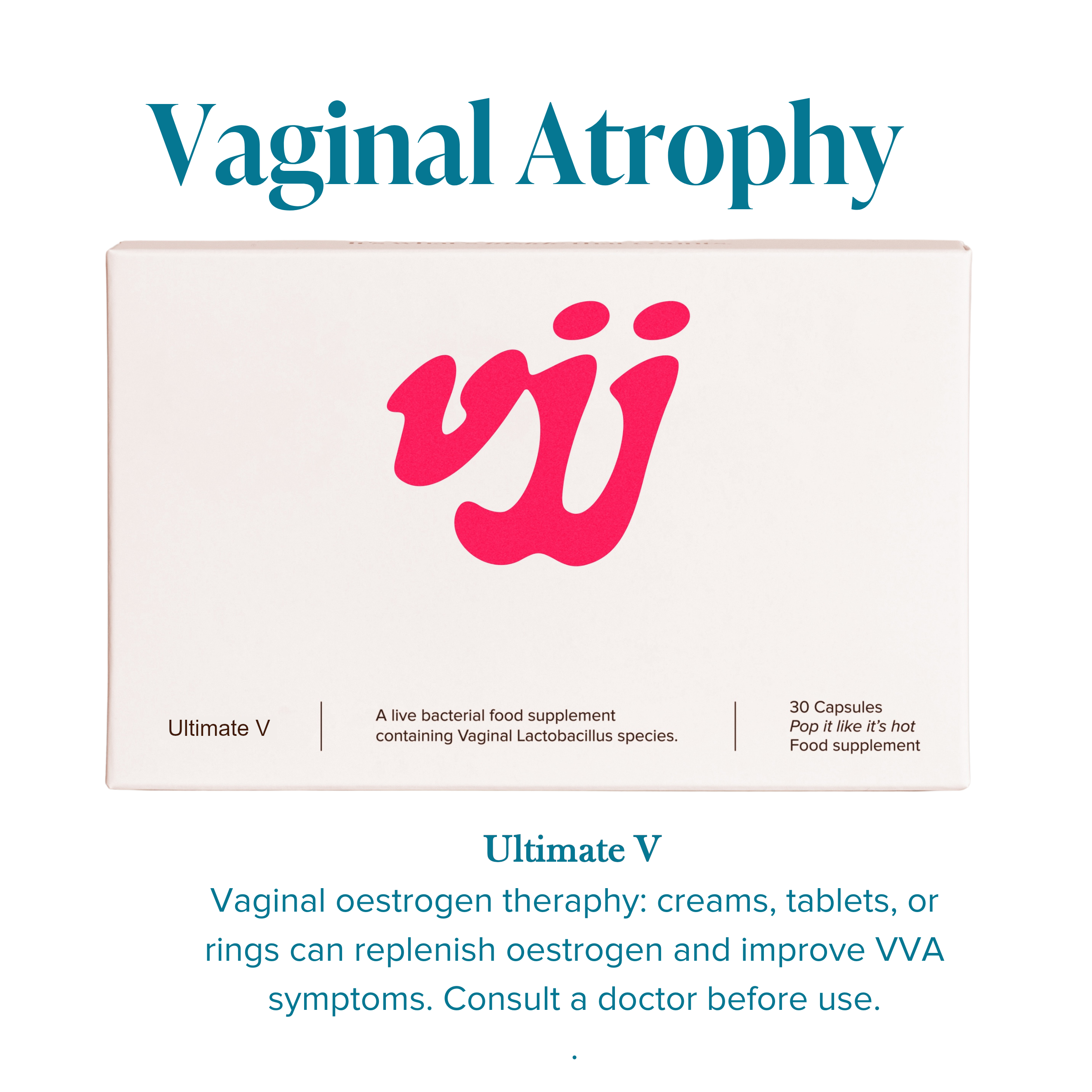 Most of the issues of Vaginal Atrophy can be improved by taking oestrogen, either as HRT or as a topical oestrogen directly into your vagina. There is published evidence that taking a daily Lactobacillus probiotic like Ultimate V can improve your vaginal health in menopause, helping prevent infections and improving lubrication.